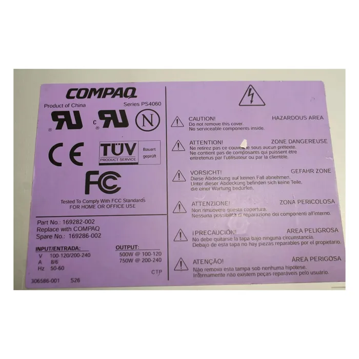 - HP 169282-002 | 750-Watts 100-240V AC 8.0A 50-60Hz Hot-Plug Redundant Power Supply for ProLiant 3000 / 5500 / 6500 Series Servers