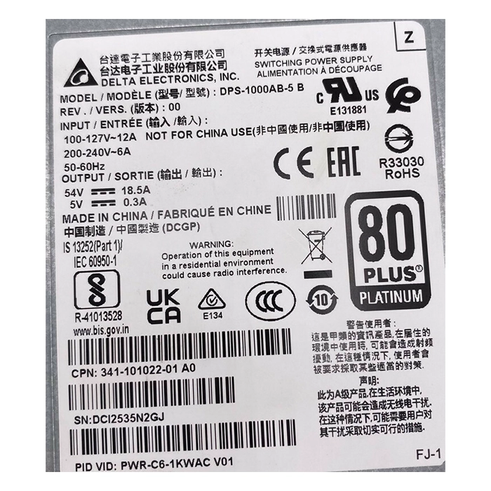 - Cisco 341-101022-01 | 1000-Watts 80-Plus Platinum Hot-Swappable Redundant 100-240V AC Power Supply for Catalyst C9200 / C9300LM Series Switches