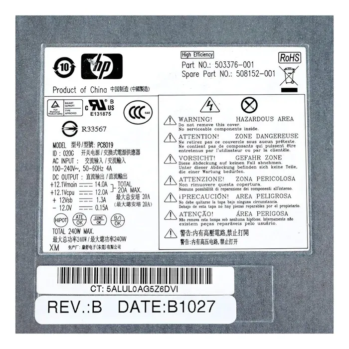 - HP PC8019 | 240W 100-240VAC to 12VDC ATX Proprietary Power Supply for HP Pro 4000/6000 Elite 8000 SFF PC