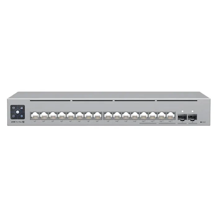 - Ubiquiti USW-PRO-MAX-16-POE (180W) | Pro Max 12 x Ports PoE+ RJ-45 4 x Ports PoE++ 2.5GbE RJ-45 + 2 x Ports 10GbE SFP+ Layer 3 1U Rackmount Switch